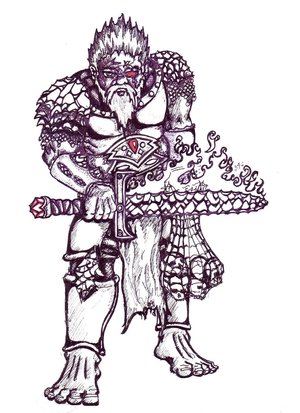 He wields a massive great sword, said to have been taken from a Demon God. This blade is also obsidian, and wreathed in white hot flame. When Dvorn took the throne it is said that he severed the head of the previous king with one fell swoop, the same fate has befallen any of those who challenge him.