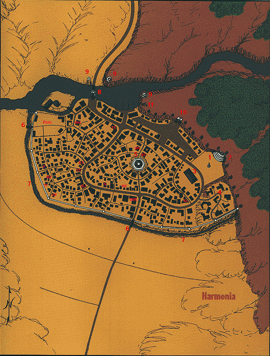 A sparkling river, swift and deep, borders the community to the north and flows powerfully westward. The low foothills of the Balinoks rise to steep cliffs better than 40' high framing the city to the east, and a long moat separates the 15' stone walls to the south from the farm and pastureland.