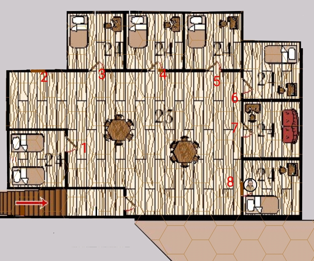 Beneath the bed a small sack contains a few coins, a couple of semiprecious gems, and a sheathed dagger. The desk contains writing paraphernalia and a stack of papers that look like they might be bar-records or a list of supplies. In addition, there is a list of names, some of which are crossed out...