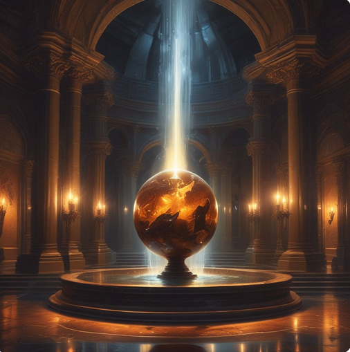 A soft golden glowing light pours down from the vaulted ceiling as a waterfall descends in the center of the room. The spray sparkles and glitters off of the natural stone walls in a cascade of light amd sound. A strange pedestal, worn smooth by ages of water, supports and odd oval shape of blood-red in the center of the stream; but it is unclear at this distance what it could be.