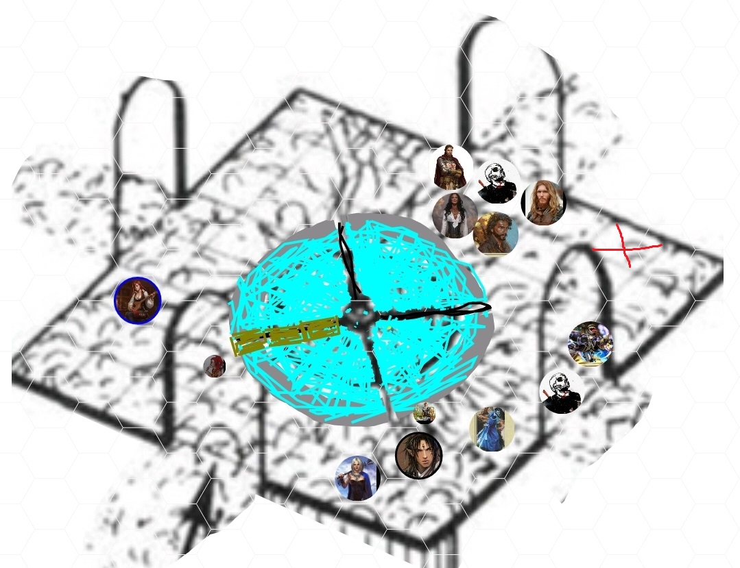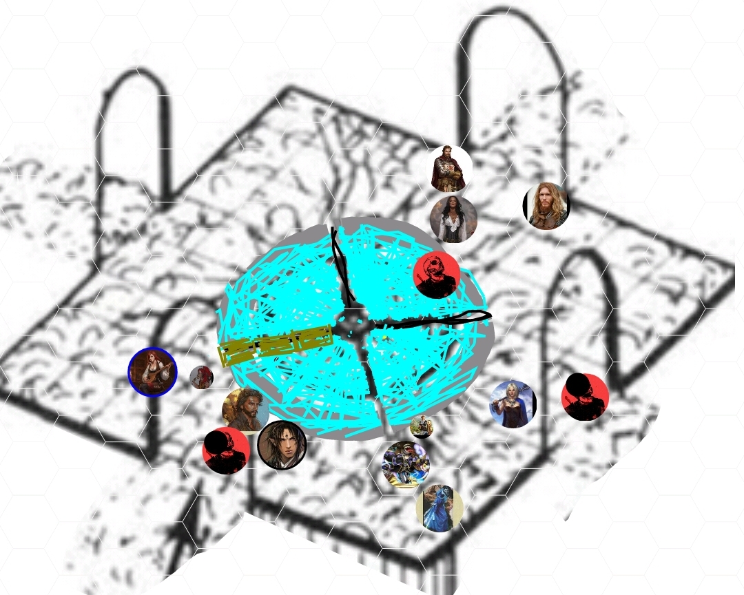Adran draws his sword and moves 45 feet around the pit to the south towards the Gate near Jerry.