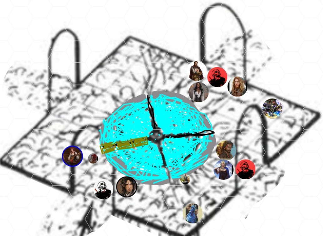 Cross and Merrick fire magical missiles at the skeleton, but both spells dissipate as they strike as if the creature had some form of resistance! Mira shouts at Pyros as he dons the Crown and concentrates, but aside from the Skeleton taking notice, nothing obvious happens. Jerry shouts to Elsa and Adran to move towards her to enter the other gate. Elsa has already begun searching for small stones and finds a pair as she begins her spell.