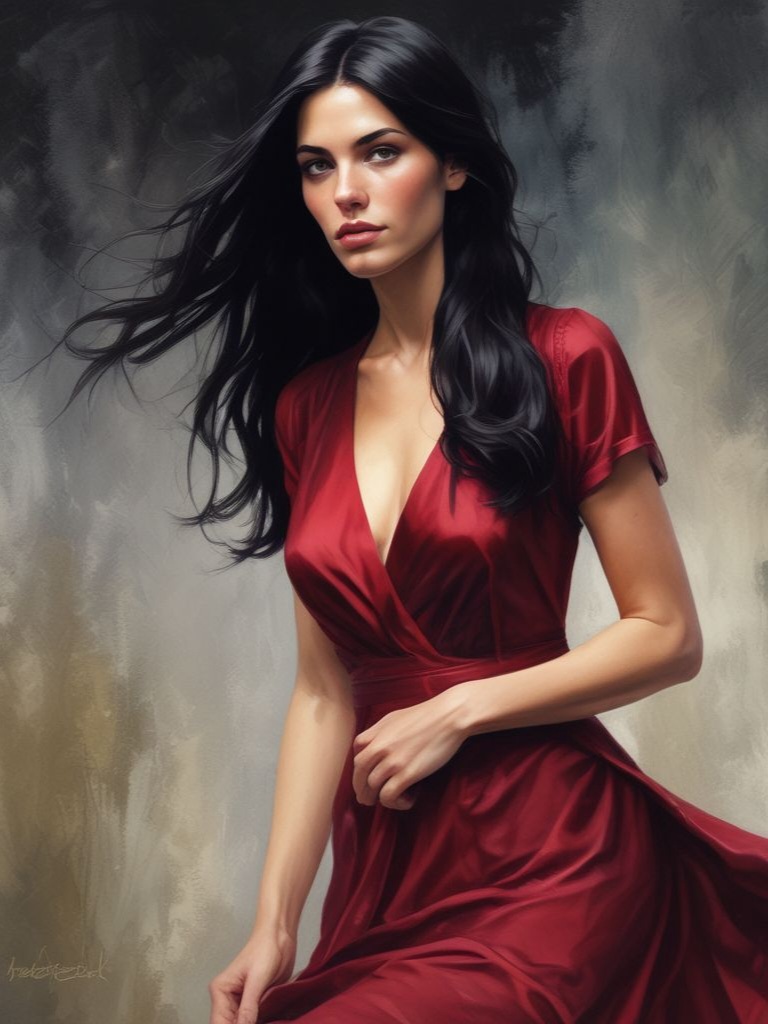 His boots echo down the lane with a strangulated, muffled quality; though the voice in the distance remains bright and clear. There was an inn around here somewhere... there always was in Thel Jeers. At first it seemed like the music wasn't getting any closer, but then the fog cleared just enough to see... A stunning woman in a snug dress of maroon silk sways as she hums quietly now. Tresses of raven hair dancing about her shoulders as she spins and twirls in languid graceful circles; dancing with closed eyes in the night. Slowly those lids open, and violet eyes regard Kybalion. A small smile begins to curl at her lips