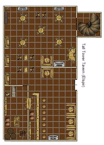 Running most of the day and night, this popular hangout caters to Elspir's regulars and most of the adventurers that pass through town. This 110 x 60 foot tavern has 6600 square feet of floor space. The tavern can seat up to 89 patrons, yet could easily host more with the amount of open floor space it has.