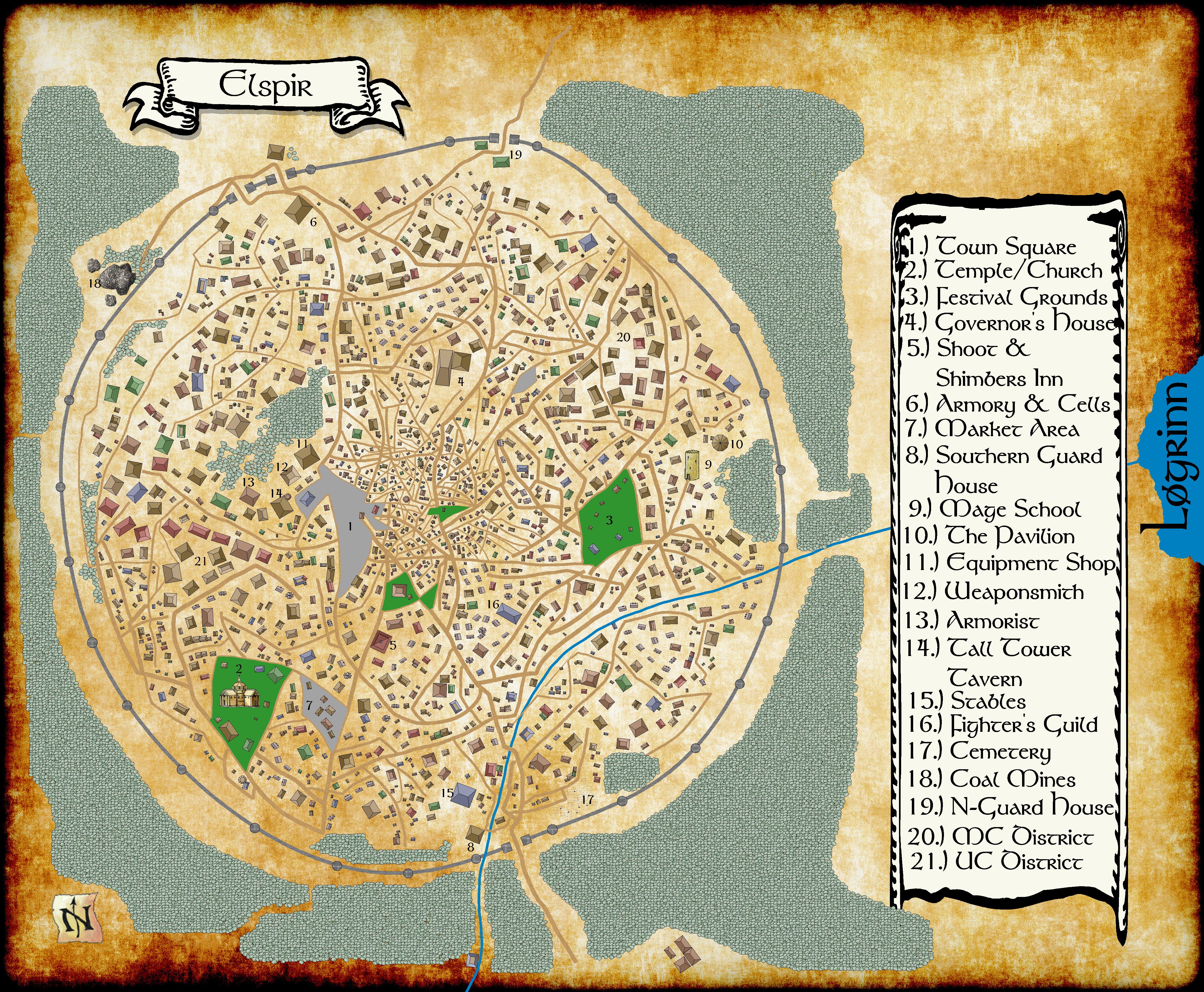 Elspir is a medium sized city and is completely fortified by 8' thick and 20' high stone walls. Elspir rests near the southern border of Bryn, not far from the borders of East Ekothia and near the shores of a large body of water known as Løgrinn or "The Lake". This city has continuously grown since it's inception in the year 727 BWoR (Before War of Religions).