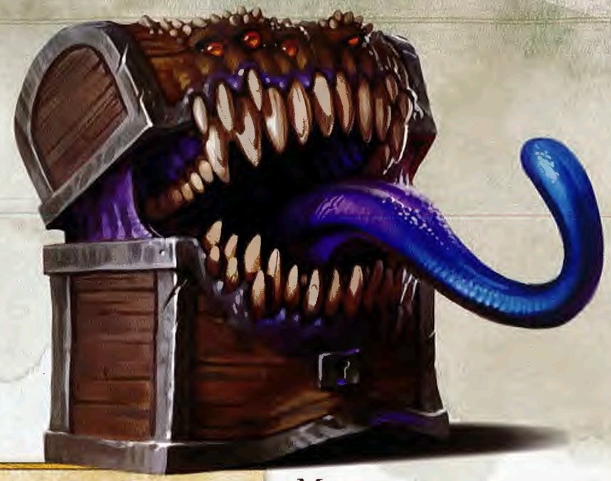 Pyros checks and doesn't find any traps. He reaches to lift the lid to see if it is lcocked. The surface of the chest itself seems like hardened stone almost... then the lid opens revealing a wet, violet interior that jiggles and flexes. The surface of the chest itself splita and ripples as sickly yellow orps sprout from tiny openings as they widen. Row upon row of razor-sharp teeth morph from the rim of the now open lid as the mass expands! Pyros tries to pull his invisible hand away, but it is stuck!