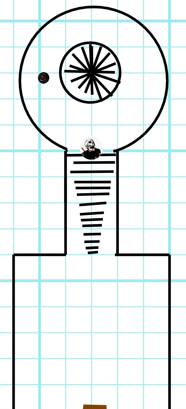 The pit ends in a flat circular floor, the stairwell coming down into the center. The door is in the wall of the pit straight across from the edge of the stairs. No additional bones